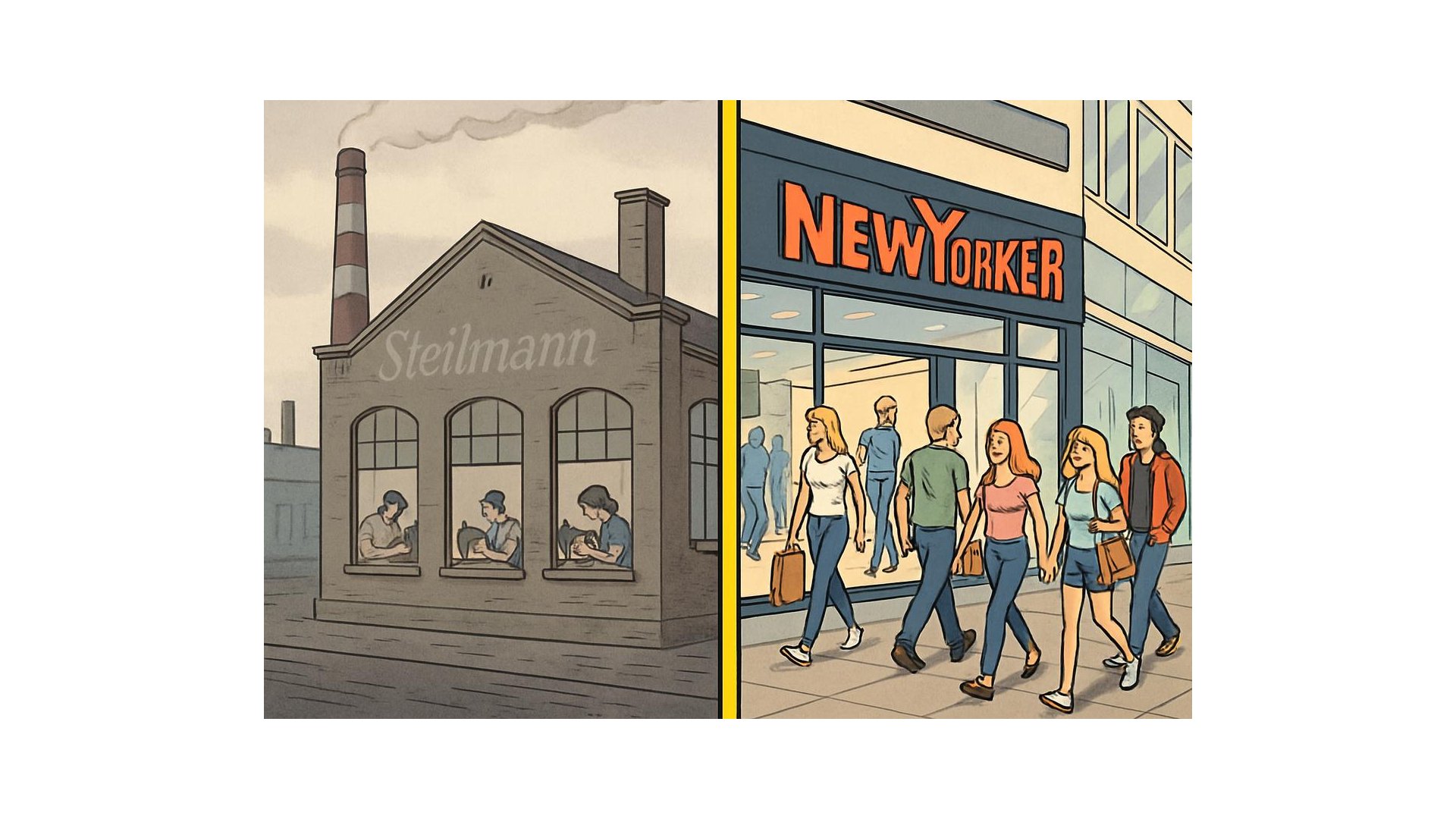 Der entscheidende Unterschied: Steilmann war Produzent, Knapp wurde vertikal integrierter Händler. Während Steilmann preiswerte Konfektionsware für fremde Handelsketten unter deren Marken produzierte, kontrollierte New Yorker die gesamte Wertschöpfungskette: Design, Produktion, Vertrieb. Die eigenen Eigenmarken – fishbone, smog, ICONO, amisu – verkaufte New Yorker in über 1.200 eigenen Filialen in 47 Ländern.
