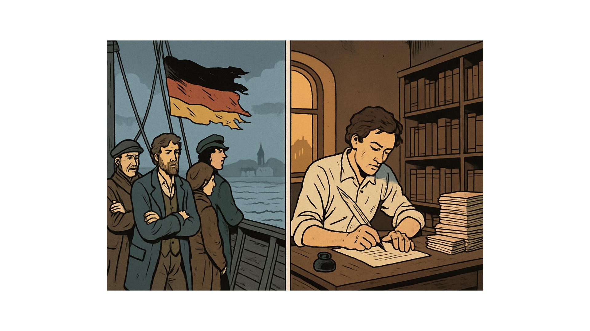 Joseph Weydemeyer und Conrad von Rappard erweiterten die Landkarte der Emigration. Weydemeyer zog ebenfalls in die USA, Rappard fand über mehrere Stationen den Weg in die Schweiz. Jeder dieser Wege steht für ein zerschlagenes Leben, das neu zusammengesetzt werden musste – in fremder Sprache, fremder Kultur, unter fremden Gesetzen.