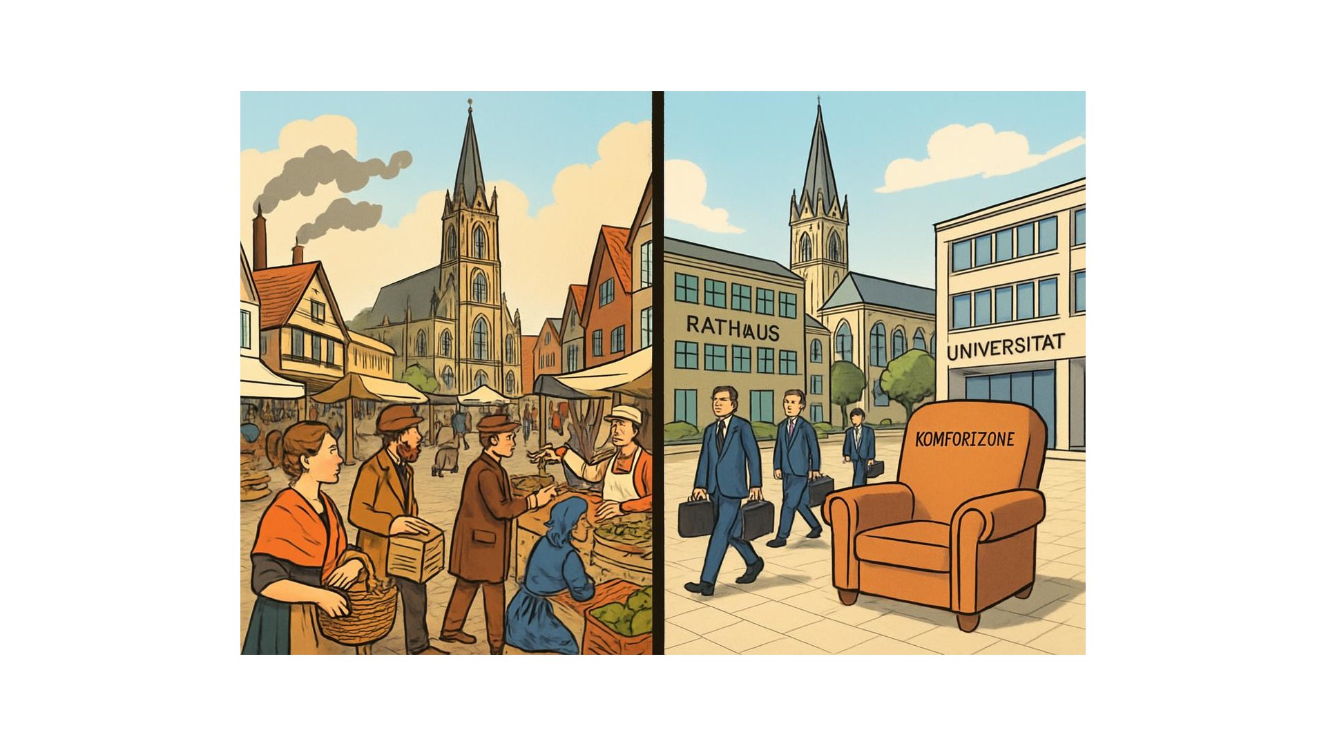 Das Problem ist nicht, dass Münster und Warendorf Verwaltungs- und Bildungszentren geworden sind. Das Problem ist, dass sie fast ausschließlich das geworden sind. Der einstige Handelserwerbssinn wurde durch behördliche Sicherheit, Bildungsbürgertum und das Leitbild der lebenswerten Mittelstadt ersetzt – mit allen aktuell sichtbaren Nachteilen für ökonomische und innovative Entwicklung.